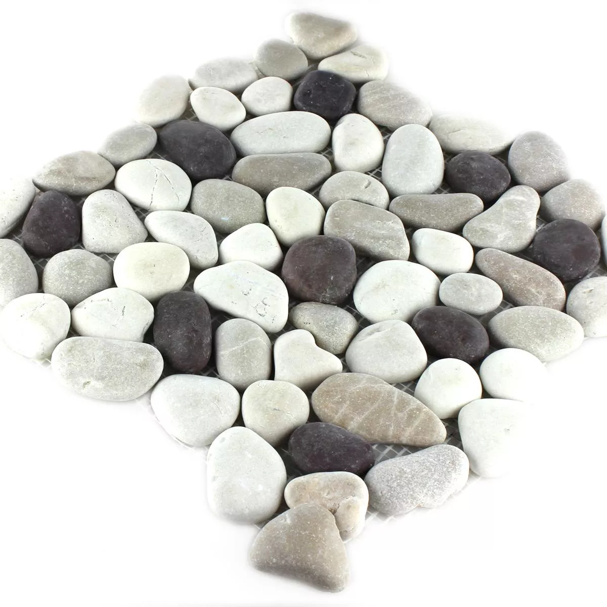Les carreaux de mosaïque sont disponibles en deux variantes. D'une part, il y a la variante en anthracite et d'autre part la variante dans le mélange de pierre de blanc, beige et rose. Les tapis sont jointoyés après avoir été collés, ce qui donne une surface rugueuse. Ils conviennent particulièrement comme revêtements muraux ou comme revêtements de sol. En plus d'une utilisation en intérieur, les carreaux de mosaïque de galets de rivière conviennent également aux zones extérieures ou humides. L'entretien des galets de rivière est très facile. Comme il s'agit d'un matériau naturel, des agents de nettoyage disponibles dans le commerce peuvent être utilisés. Ils sont absolument faciles à entretenir et durables.