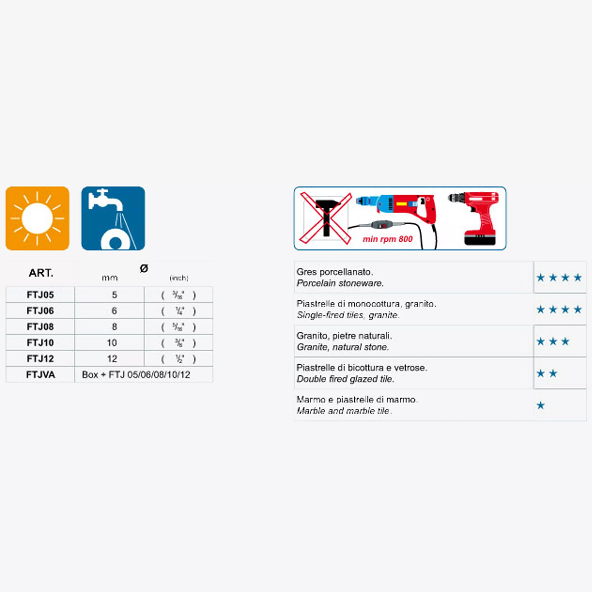 Le foret diamanté convient à une perceuse à 800 tours par minute ou plus. La couronne n'est pas applicable à des vitesses inférieures. Il assure une coupe nette et tente d'éviter les fissures dans les carreaux. Chaque taille est disponible individuellement. Pour la distinguer facilement des autres fabricants, elle a été peinte en vert. Les tailles individuelles sont de 5 mm, 6 mm, 8 mm, 10 mm et 12 mm de diamètre. Pour obtenir les meilleurs résultats, il est recommandé d’essuyer les surfaces au préalable. Les carreaux peuvent être traités individuellement ou installés au mur. Ajouter un peu d'eau au foret évite la surchauffe. Le diamant est durable et peut être utilisé plusieurs fois.