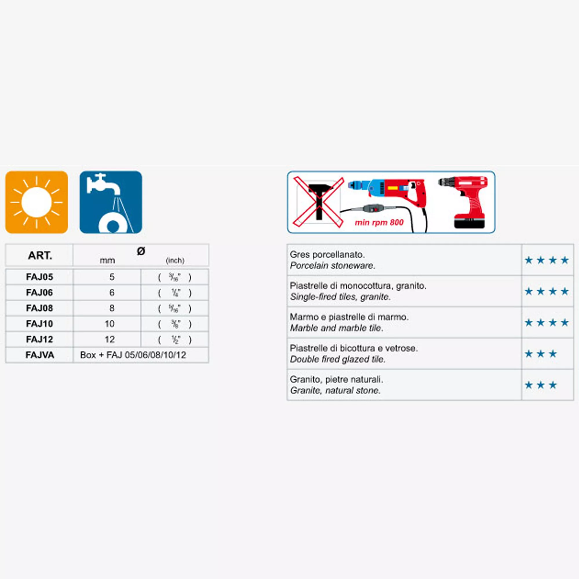 Si vous souhaitez utiliser la couronne diamantée, vous avez besoin d'une perceuse avec au moins 800 tr/min ou plus. Le foret diamant Mondrillo est disponible en 5 tailles différentes. Le client peut choisir entre les diamètres 5, 6, 8, 10 et 12 mm. Les outils diamantés comme celui-ci sont considérés comme particulièrement durs et sont conçus pour une grande variété de travaux. Bien que cet outil diamanté soit adapté au forage à sec, il existe d'autres outils qui peuvent être utilisés pour le forage à l'eau. Lorsque vous achetez un foret et un outil diamanté, vous devez faire attention à une qualité élevée et à une finition impeccable. L'outil présenté ici doit être utilisé avec une perceuse adaptée ou compatible.