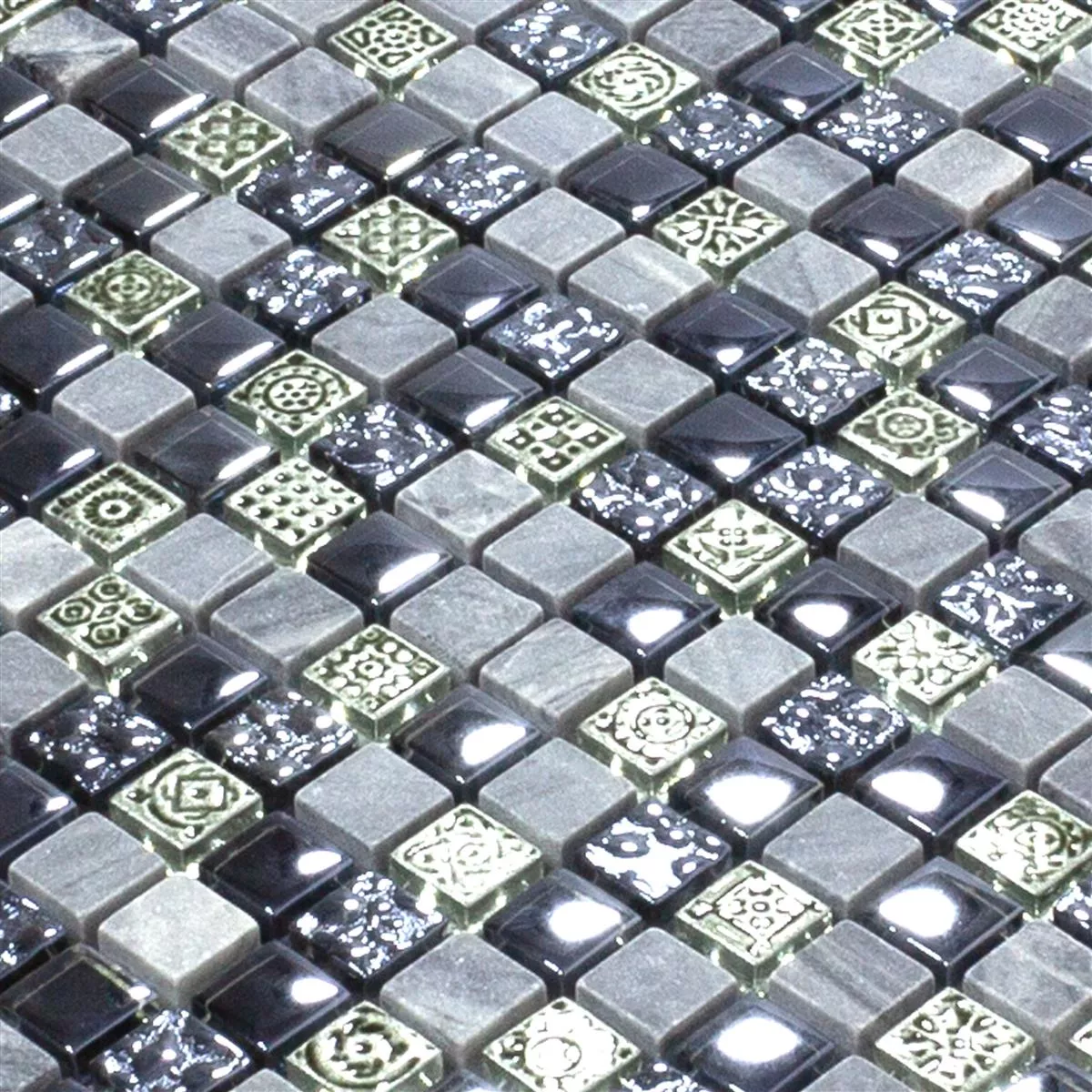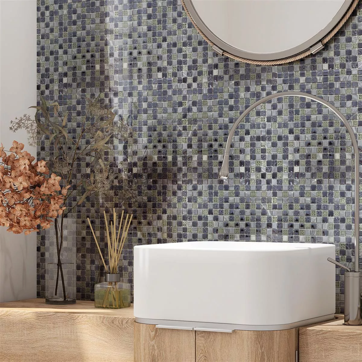Ervaar moderne luxe met de glas-marmermozaïektegels Champion Zwart Grijs Mix. De elegante combinatie van grijs en zwart, gecombineerd met een gevarieerd oppervlak van mat, glanzend en gestructureerd, zorgt voor een eigentijdse uitstraling. Deze mozaïektegels, gemaakt van natuursteen, marmer en glas, bieden niet alleen visuele verfijning maar ook robuustheid.