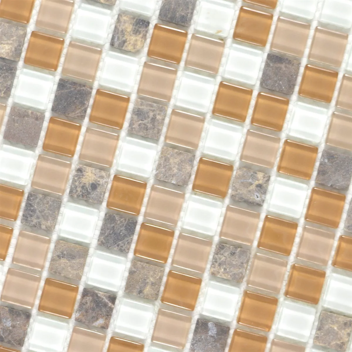 De glazen natuursteen mozaïektegels Zekova in de kleurvariant beige bruin wit bestaan afwisselend uit marmer en glas. De glazen natuursteen mozaïektegel Zekova heeft een steenmaat van 15 x 15 mm. Verder hebben de stenen afwisselend een mat en glanzend oppervlak.
