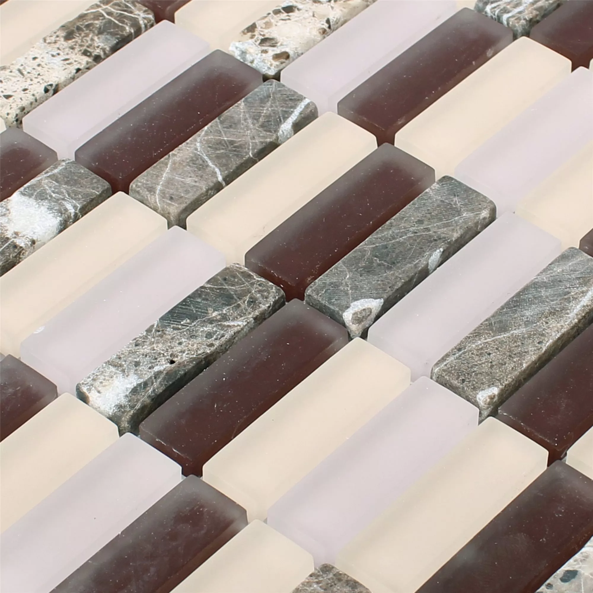 De Conrad glasmozaïek natuursteentegels hebben stenen in de kleuren paars, bruin, beige en bordeaux. De steengrootte is 15x50mm. Het product bestaat uit een fascinerende combinatie van materialen glas en natuursteen. De 8 mm dikke stenen zijn bevestigd op een mat van 30x30 cm, waardoor ze gemakkelijk en comfortabel te leggen zijn.