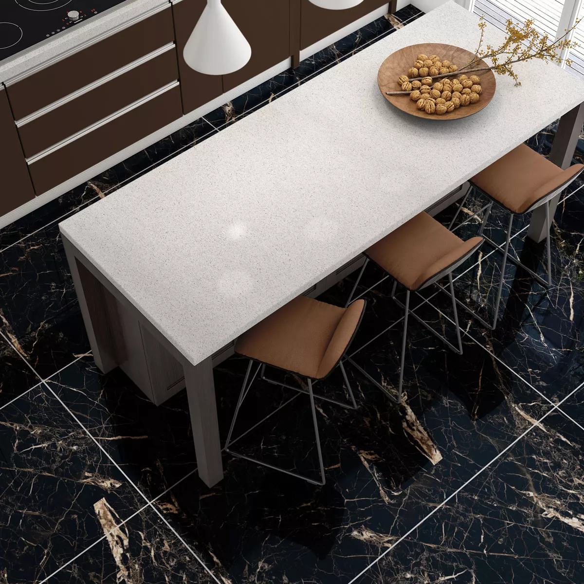 Voeg een vleugje luxe toe aan uw huis met onze prachtige Trento-vloertegels. Deze indrukwekkende zwarte tegels met gouden accenten imiteren perfect de tijdloze schoonheid van marmer en brengen elegante elegantie in elke kamer.