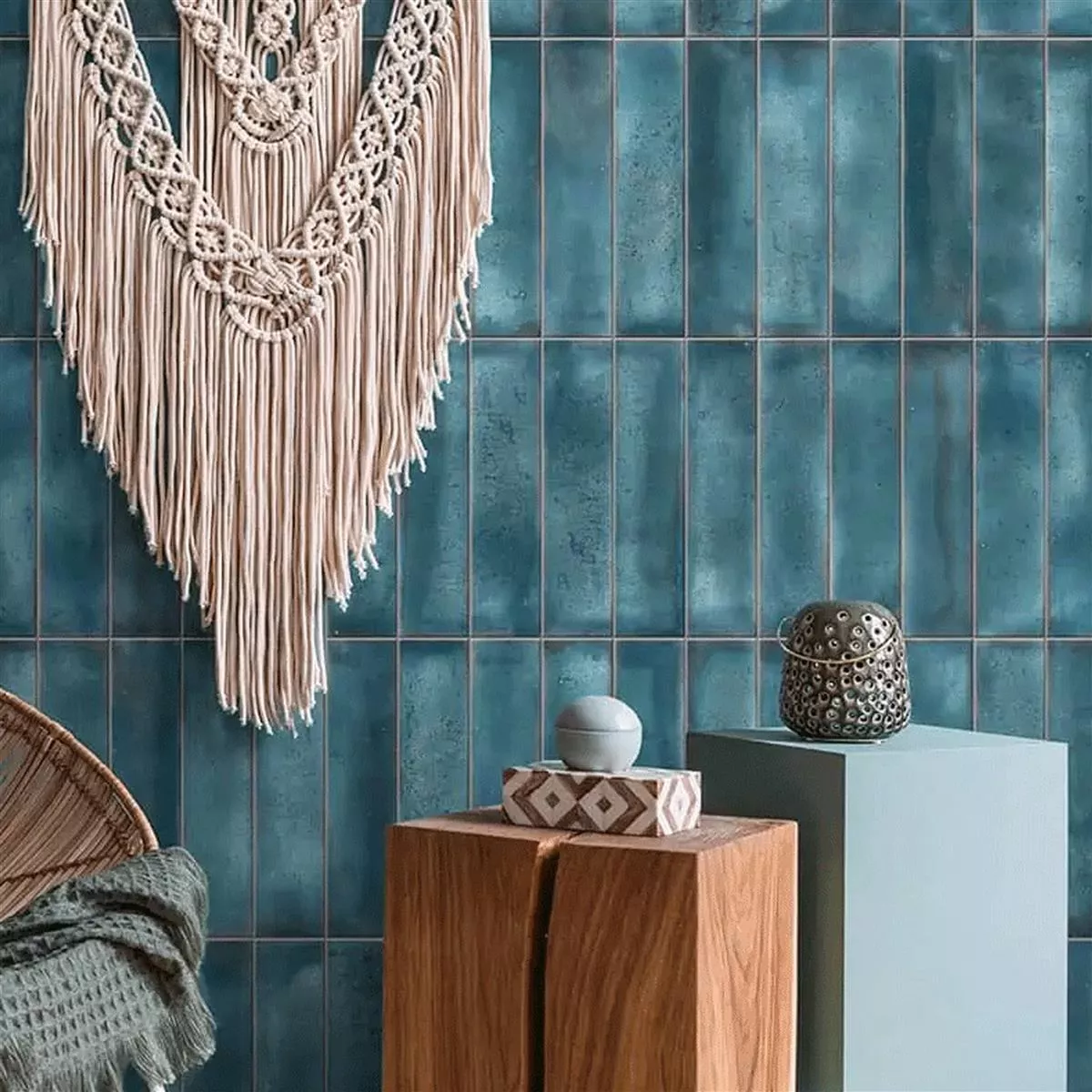 Kiowa blauwe wandtegels zijn een uitstekende keuze voor mensen die een vleugje vintage charme aan hun ruimte willen toevoegen. Deze tegels zijn gemaakt van duurzaam steengoed en bieden een glad, glanzend oppervlak met een gegolfde structuur die een interessante textuur en diepte creëert. De natuurlijke rand en niet-gerectificeerde constructie dragen bij aan de authentieke vintage look die elke kamer een tijdloze flair geeft.