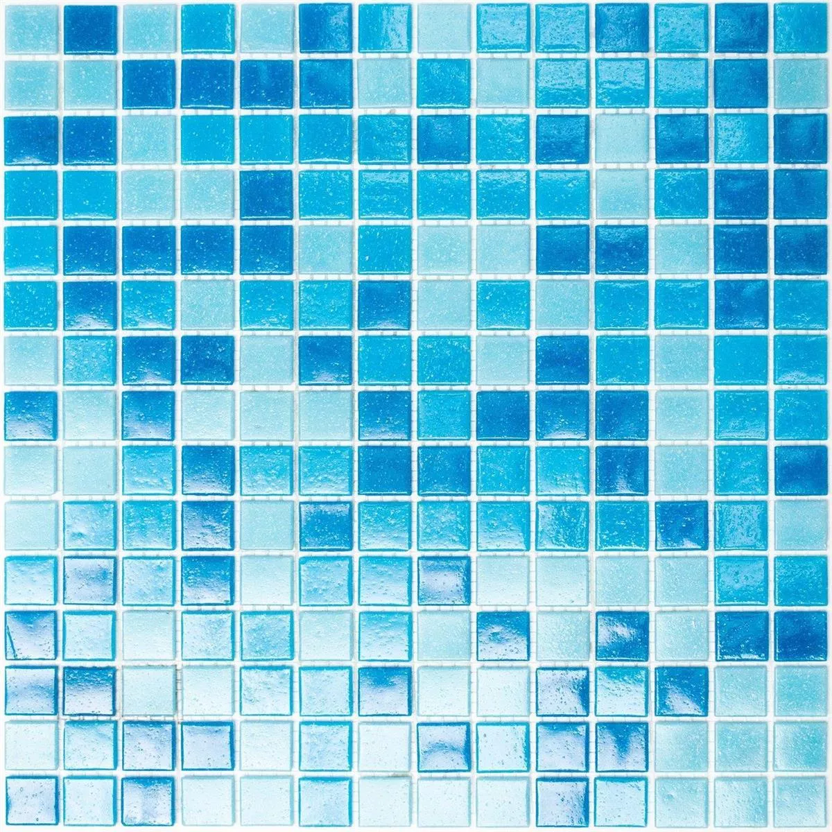Blauwe mozaïektegels voor binnen- of buitenzwembad. Papier verlijmen maakt het snijden gemakkelijker voor de vakman. Dankzij het glazen oppervlak zijn ze snel schoon te maken.-