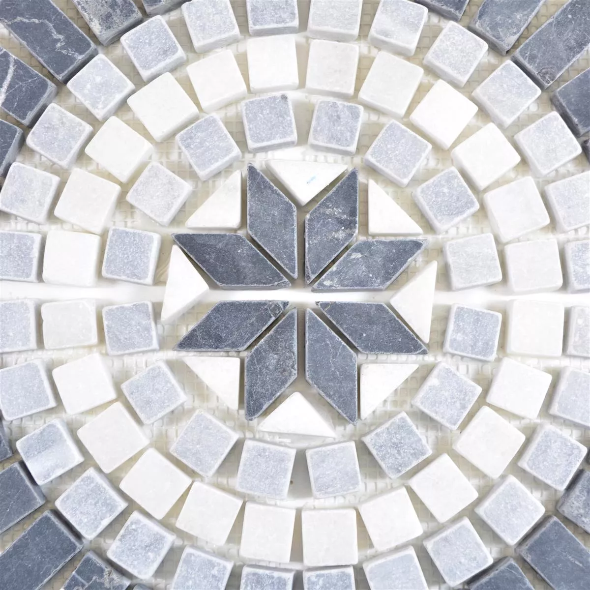La tuile en pierre naturelle Rosone Frisco est une vraie beauté. Il est en noir, blanc et gris et se présente sous la forme d'un tapis carré. Les pierres individuelles sont conservées dans des tailles variables. La raison en est le motif en mosaïque chic. C'est un motif circulaire avec une sorte de fleur au milieu. C'est une tuile attrayante que les gens aiment regarder.