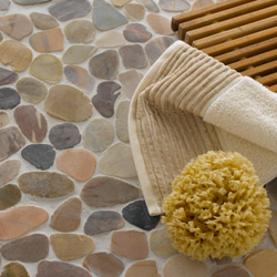 - Rivierkiezels of natuursteenkiezels als kiezelmozaïek - vlak geschuurd - ook verlijmd op het net - verbeterde loopeigenschappen en vereenvoudigde reiniging